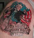 Tattoo of red, white and blue fire helmet with 9-11 inscribed below the tattoo, on Joe Teijeira, of the LAFD. Tattoo was done by Triple X Tattoo. on Joe Teijeira, L.A. Fire Dept (No link to larger picture)